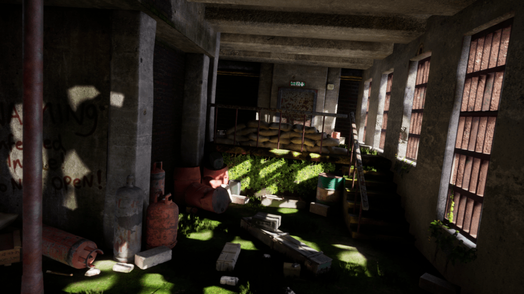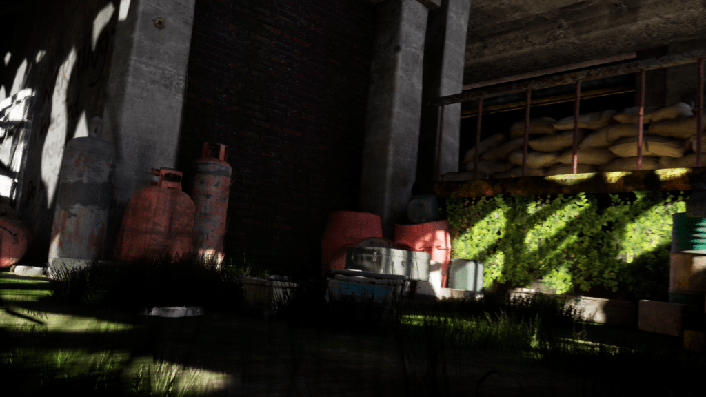 The barricades of sandbags against the wall and throughout the area are relatively new in comparison to the overgrown areas of the floor and walls. This implies to the player that they have been built recently and may indicate the presence of police in the area soon. This increase the tension of the overall mood as not only does the player have to worry about the threat of infected but also the risk of being caught by the police who are now a corrupt organisation. It also suggest to the player that as the area has been recently inhabited the player may be able to find useful resource within the immediate area.