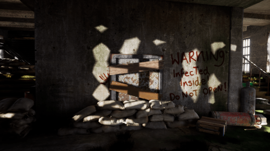 The writing on the wall by the door clearly tells player the dangers behind it. Though the player is unable to reach the lower level through this access point it plants the idea of the risk of encountering infected throughout the rest of the building. This not only indicates what may happen next but also serves to convey the overall theme of the world that nowhere is safe.