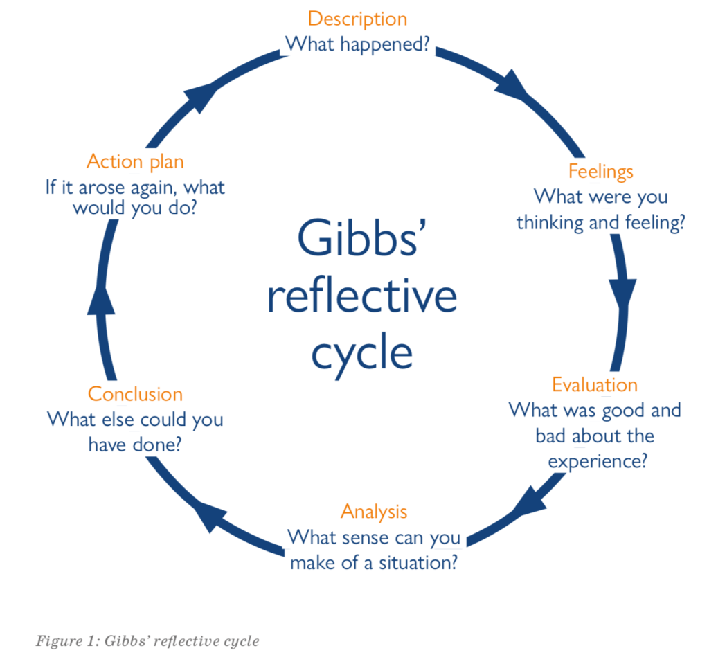 Having identified the key things I want to work on I will use the “Gibbs’ Reflective Cycle” to act upon the goals I have set myself. The “Gibbs’ Reflective Cycle”, developed by Graham Gibbs in 1988, gives structure to learning from experiences; it is one of the most used and most famous cyclical methods of reflection. It offers a framework for examining experiences, and is comprised of six stages: