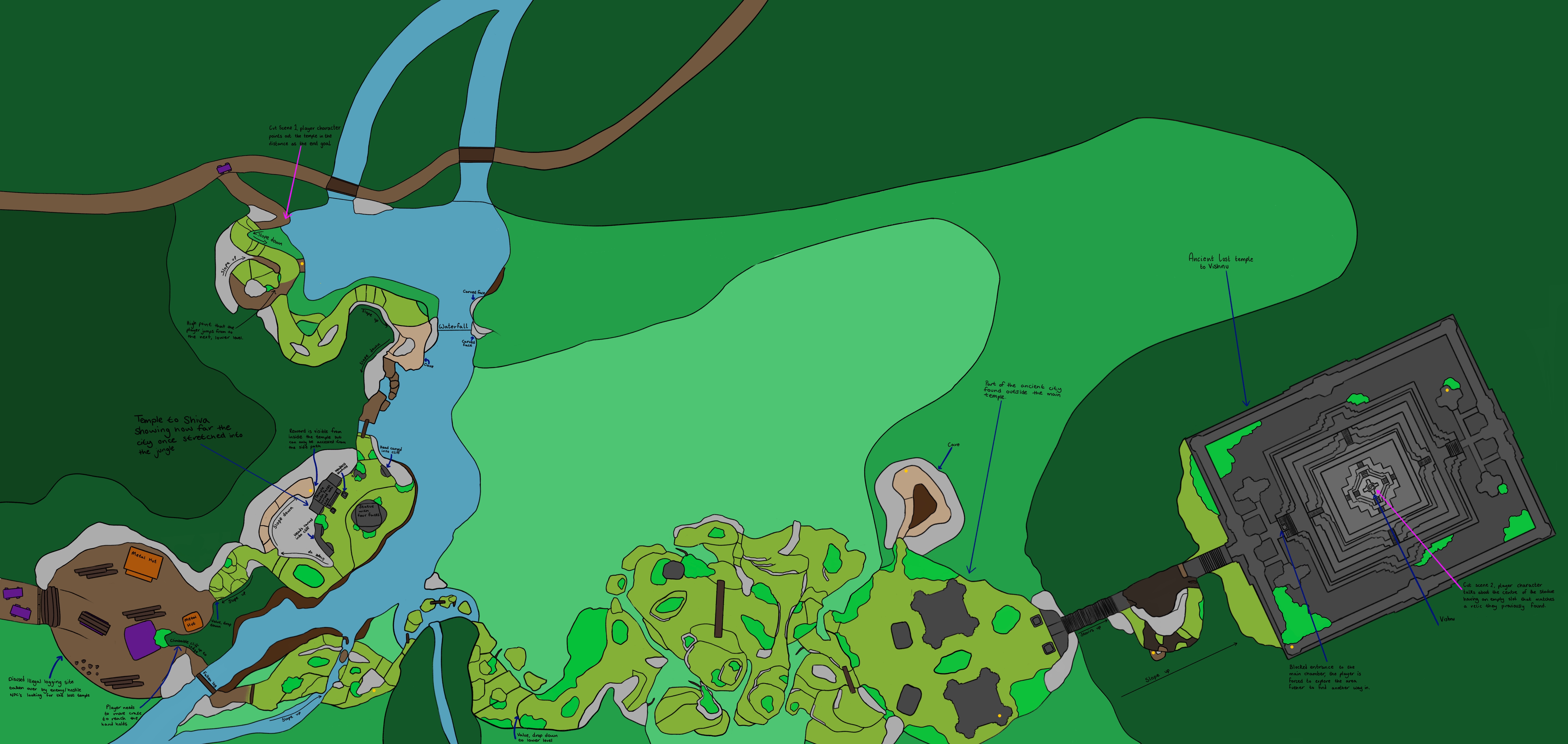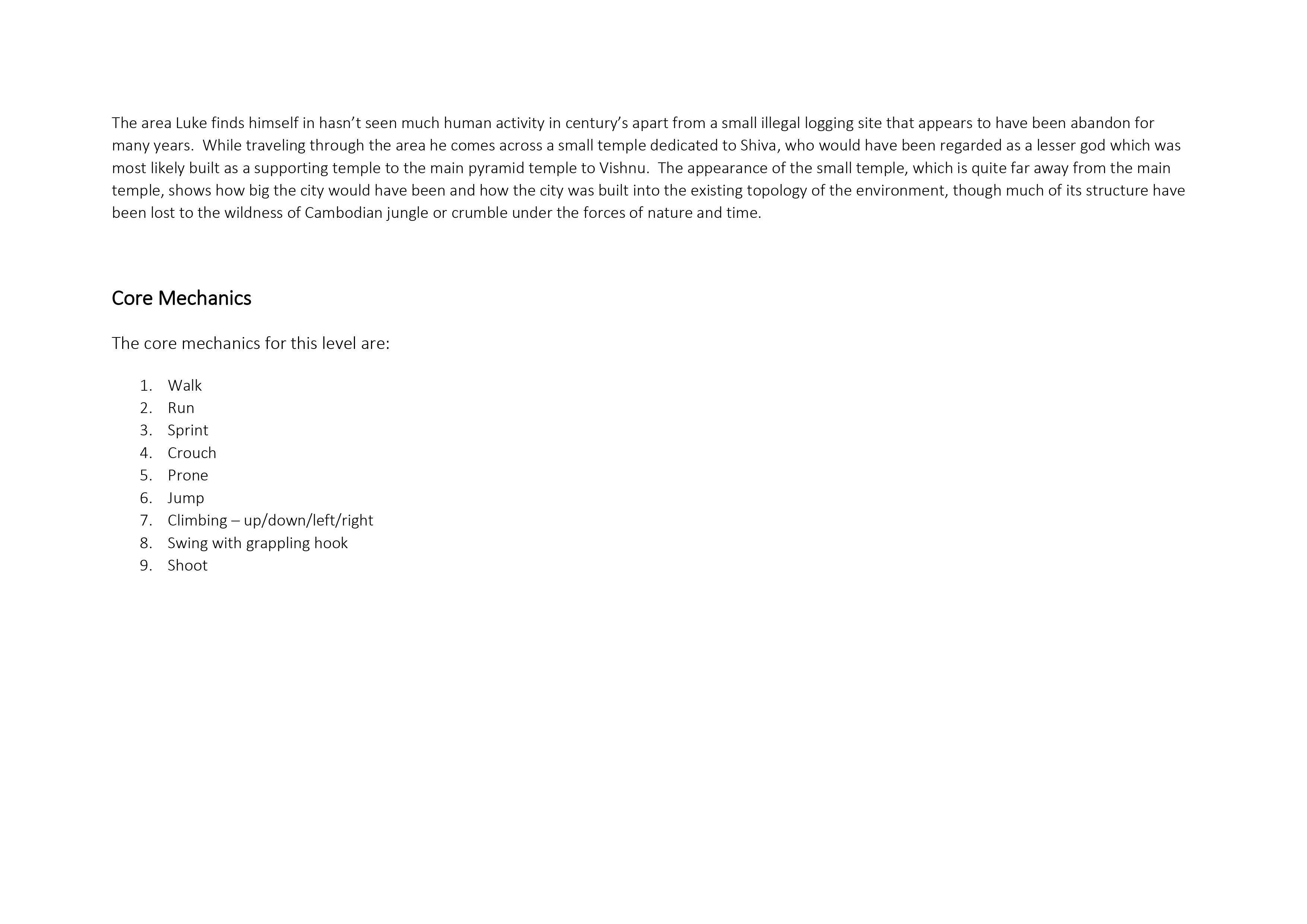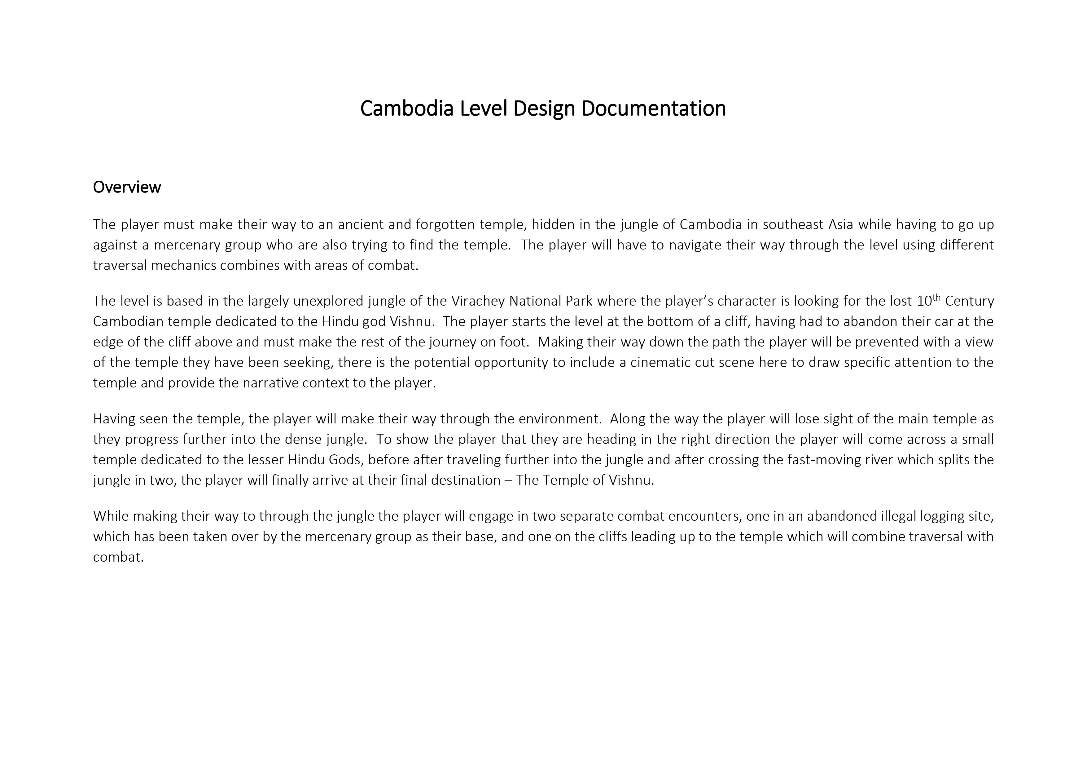 To make sure that I had a clear vision for the level I created a level design document for the level. Though my focus for this project is on Cognitive Mapping I took the time to develop the overarching narrative for the wider game as well as the level I will be creating. In industry, action/adventure games like the ones that inspired my level are all very narratively driven so I felt that taking the time to think about the narrative behind the level would be beneficial for the design process.