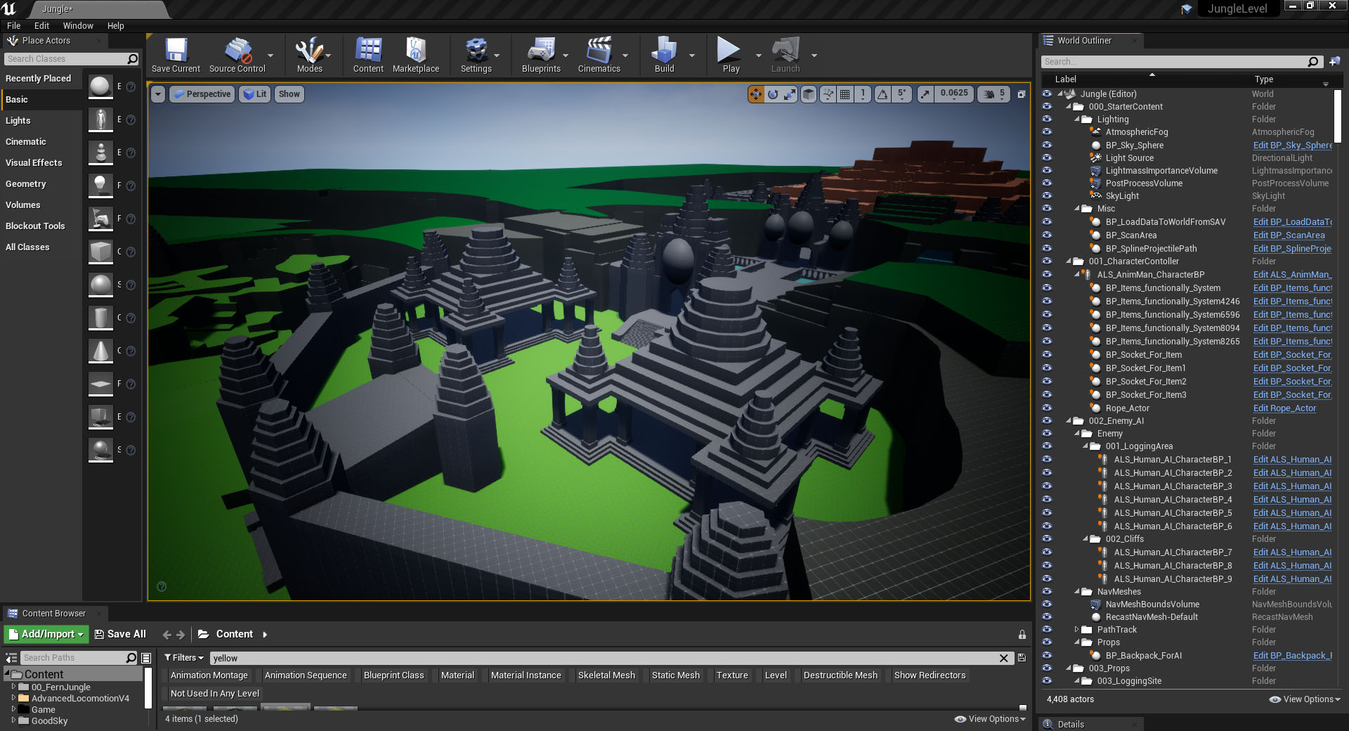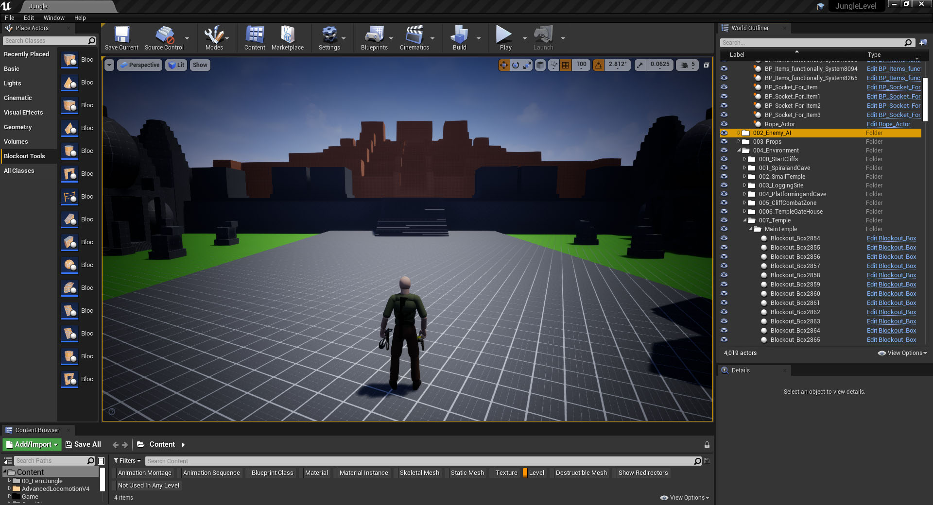 With the temple now visible again from the vista points, I carried on blocking out the temple structure, starting with the first section of the temple district. I used this first section to play around with what shapes to use to achieve the layered pyramid effect found throughout 12th Century Cambodian architecture from the Khmer Empire (fig 18-19). The architectural style is very important to convey the setting to the player but also for a player’s ability to form cognitive maps. Cambodian architecture from this era is very geometrical with a lot of repeating patterns and shapes which contrast with the surrounding natural and organic nature of the jungle. This contrast, both in the shape and colour – with the greys and reds of the rock standing out against the green foliage, allow the landmarks to stick out in the environment and draw the player in; cementing them in the player’s mind and their cognitive maps.