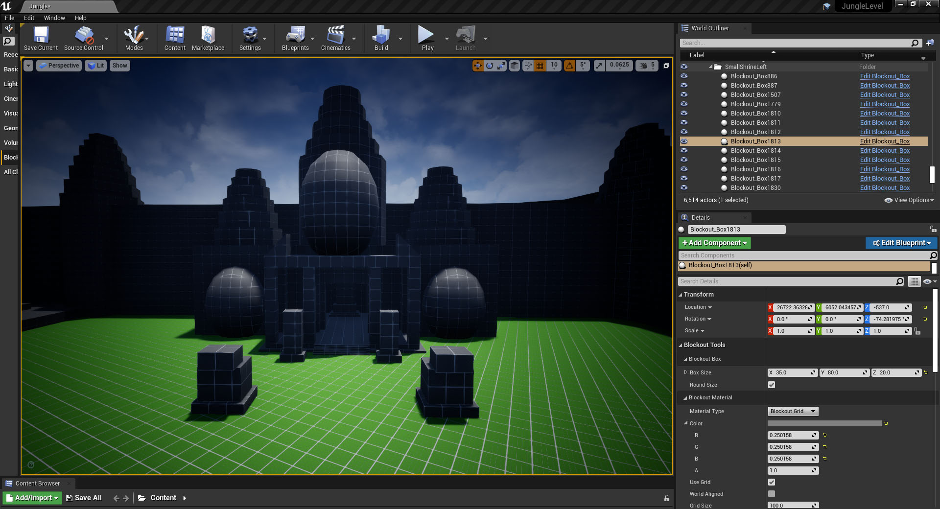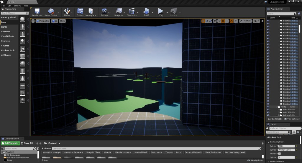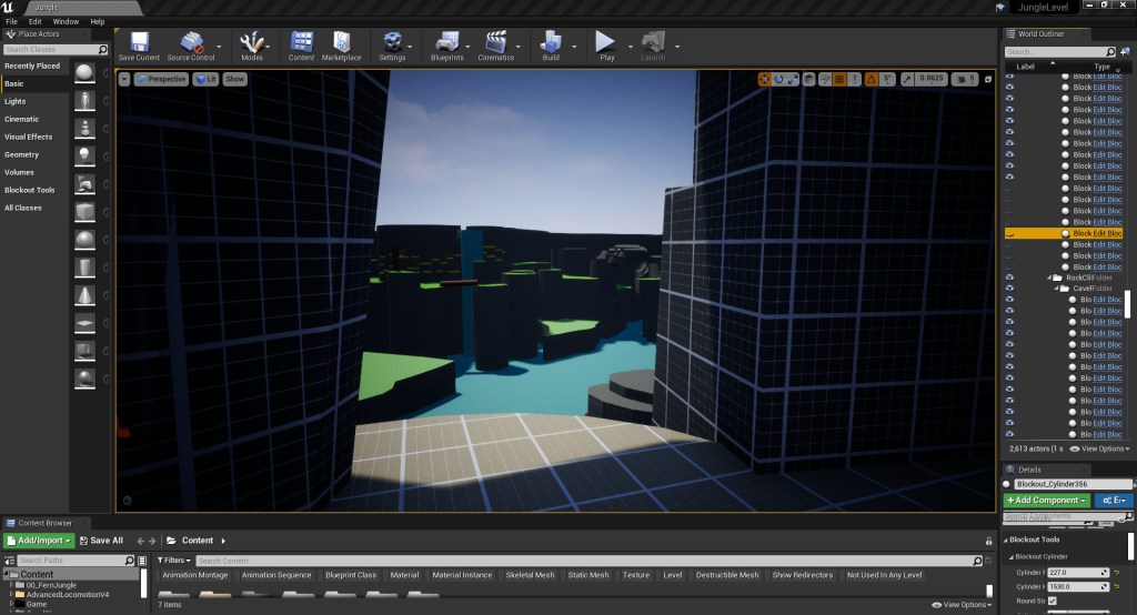 I decided that the beginning part of this week would be spent iterating on the areas I had already created and applying the feedback I had received from the earlier playtests. I started by playtesting the entire level from start to finish and really analysing the starting sections as the views had really changed with the addition of the later areas. When I originally blocked out the early sections of the map I had to imagine, based on the 2D map what the sightlines and views would potentially be. From doing this I realised that I need to make some small changes to the first small cave before the temple as players are able to see too far into the level and the space, in general, looked too open and not overgrown enough for the Cambodian jungle. I changed the size of the opening in the cave to limit the view the players have as well as block off the view of the opposite shore through the addition of the higher cliff between the two (fig 1-6). The player is still able to gain a glimpse of what is to come but they are denied a full view of where they are going until they progress further into the level.