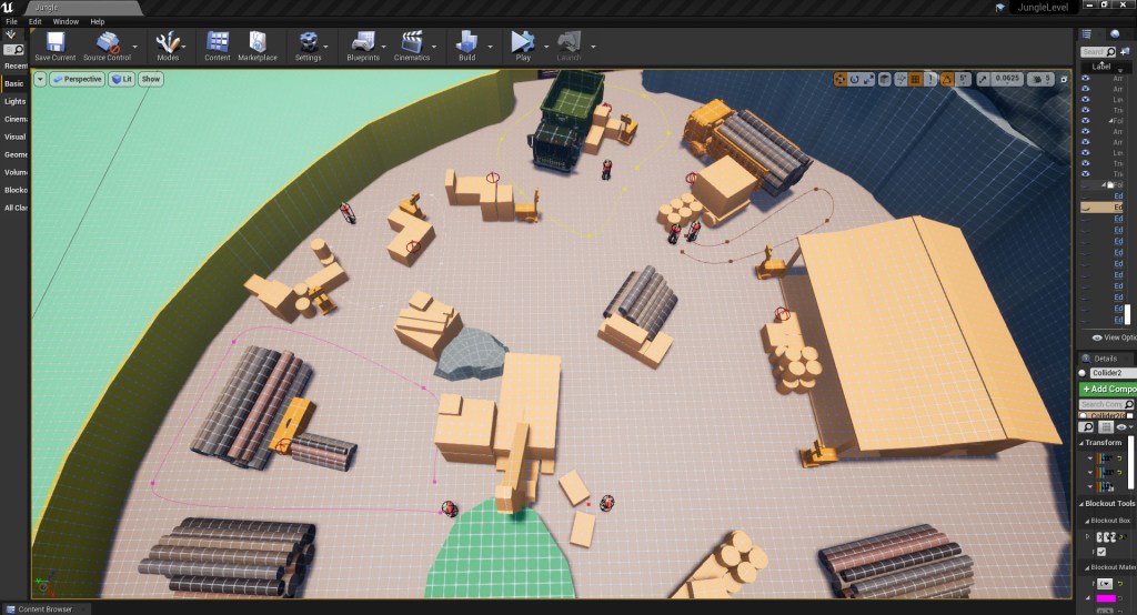 - Add specific enemy routes so that they don’t just randomly patrol the area. While I have kept most of the enemies patrolling the other three are stationary. The first stationary enemy can be found in the first building the player sneaks through to enter the area, the second can be found by the broken digger with the third one standing near the abandoned logging truck. These enemies are optional engagements, as the player can choose to attempt to sneak past them and only kill the moving enemies (fig 10-11).